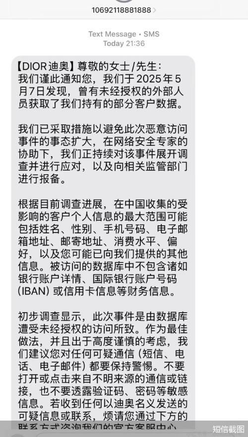 高奢客户信息安全问题被推上风口浪尖。5月12日晚间,LVMH集团旗下Dior迪奥品牌向用户发布短信,表示该品牌发生数据泄露事件,迪奥方面于2025年5月7日发现,曾有未经授权的外部人员获取了迪奥持有的部分客户数据。业内人士指出,随着数字化手段的兴起,企业可以收集更多客户数据,但也让泄密风险增强。品牌方从发现数据泄露到通知消费者时隔约5天,从时效维度来看,如无客观存在不能克服的合理理由,则存在违法的可能性。